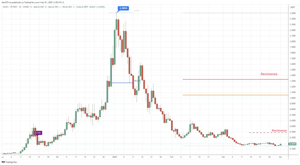 Il token Ai16Z è molto giovane ed è quotato sul mercato crypto da ottobre 2024, come si può vedere nella panoramica sul grafico daily allegato. Nei primi due mesi dalla sua quotazione, il prezzo di AI16Z ha avuto un vero e proprio boom, crescendo da un valore iniziale compreso tra 0,02 e 0,040 USDT fino a raggiungere l’ATH di 2,5094 USDT, registrato il 2 gennaio.