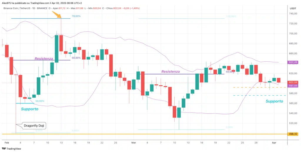 Passando all’analisi di breve periodo, il grafico daily mostra chiaramente il rimbalzo dal minimo di 507 USDT. Successivamente, il prezzo di BNB è salito fino all’area di resistenza identificata nell’analisi del 17 marzo, dove si è fermato tra 620 e 638 USDT per circa dodici giorni, prima di avviare una correzione.