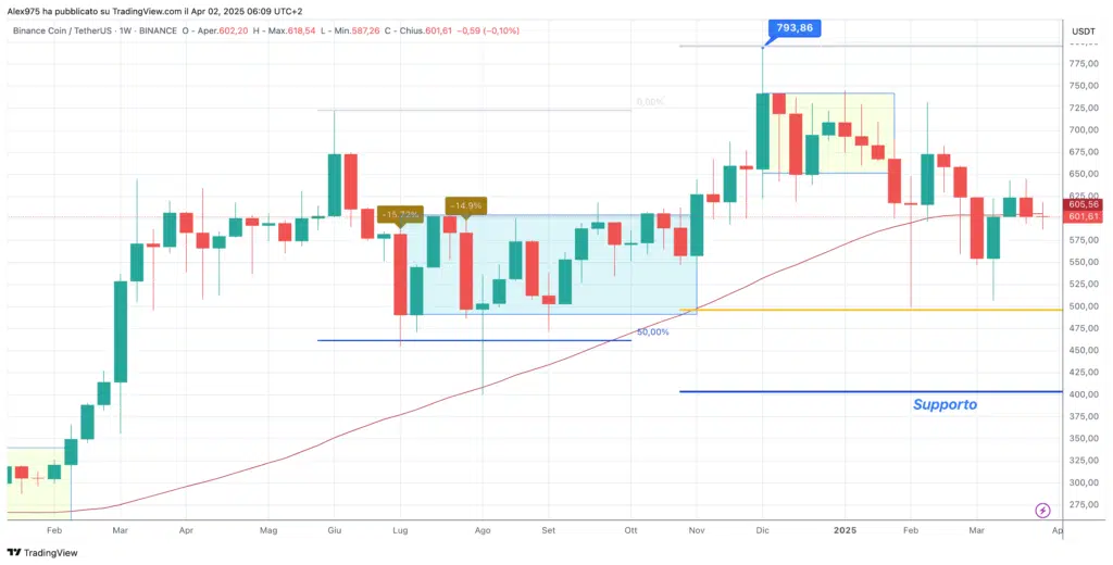 Da quel massimo storico è iniziata una fase di correzione, proseguita nel corso del 2025, con uno spike ribassista a 500 USDT a inizio febbraio. Il prezzo è crollato fino a raggiungere il primo supporto di lungo periodo, da cui ha poi rimbalzato rapidamente. Nel mese di marzo è sceso nuovamente, toccando un minimo a 507 USDT, per poi reagire con un nuovo rimbalzo.