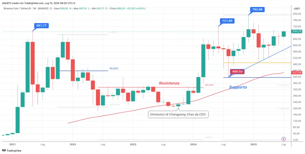 Tra aprile e maggio dell’anno passato il prezzo di $BNB ha avuto una fase di pausa e lateralità, interrotta da una spike rialzista a inizio Giugno con il prezzo che ha registrato un nuovo ATH a 721,80 USDT. Con l’estate c’è stato una forte escsursione con un minimo ad agosto a 400 USDT e nuova fase di rimbalzo che ha portato all’ATH di dicembre a 793,86 USDT.