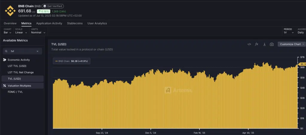 Dopo una fase di consolidamento a inizio 2025 la TVL nei protocolli DeFi dell’ecosistema BSC mostra un trend di crescita costante, sostenuto dal ritorno di liquidità e dall’espansione delle applicazioni decentralizzate.