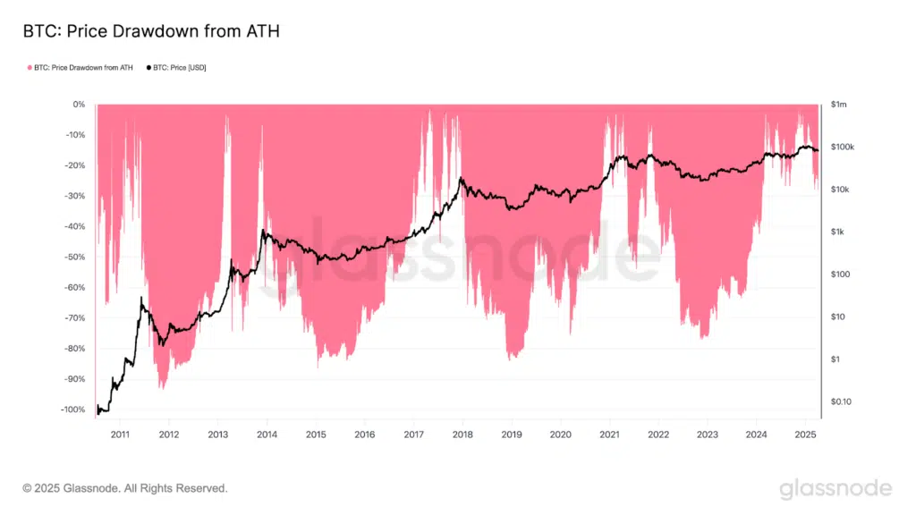 A differenza di quanto viene millantato erroneamente su Twitter, il crollo di Bitcoin dal suo ATH non appare così tanto esagerato. Secondo l’indicatore “BTC: Price Drawdown from ATH”, che analizza i cali storici della moneta dai suoi rispetti massimi storici, la situazione è in linea con quella dei precedenti bull market. Attualmente ci troviamo a circa -30% dal top dei $109.000, una percentuale che, storicamente, rientra perfettamente nelle correzioni tipiche durante i cicli rialzisti di Bitcoin.