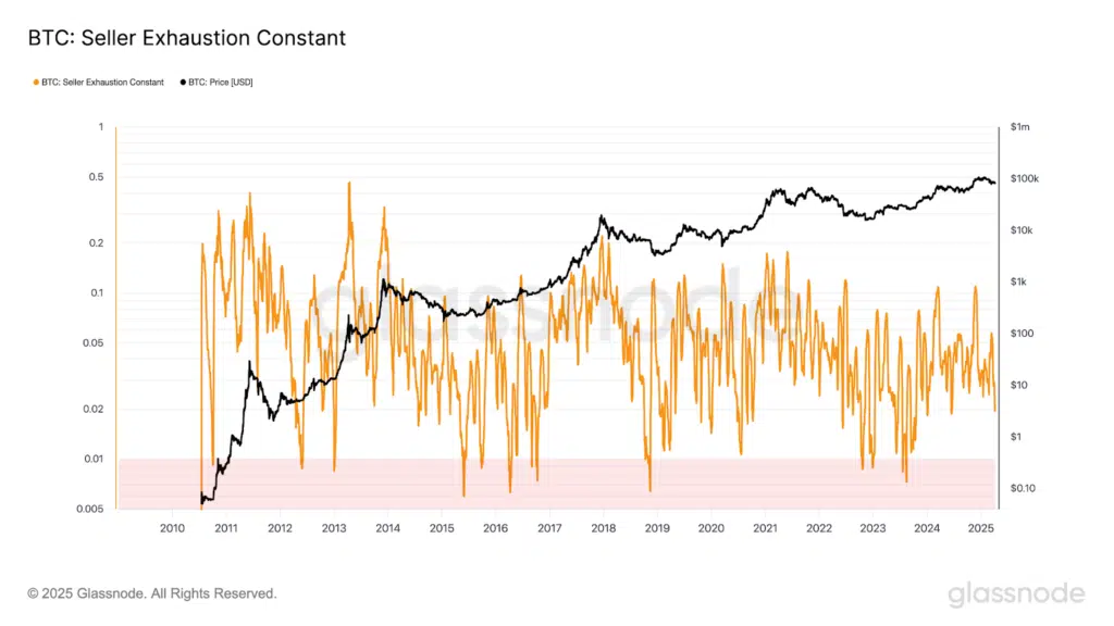 Nonostante il pesante crollo del week-end che ha portato Bitcoin sotto gli $80.000, c’è la possibilità che il bottom non sia ancora stato raggiunto. Secondo la metrica della piattaforma Glassnode “BTC: Seller Exhaustion Constant”, siamo ancora lontani dal poter dire di aver toccato il fondo.