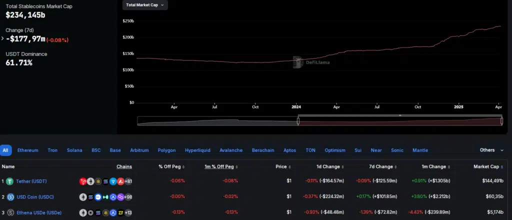 In allegato riportiamo il dato attuale, tracciato dal sito specializzato DeFiLlama: la Total Stablecoins Market Cap è pari a 234,145 miliardi di dollari. La dominance di Tether Dollar (USDT) è del 61,71%, seguita da USD Coin (USDC) al 25,78% e da Ethena USDe al 2,21%.