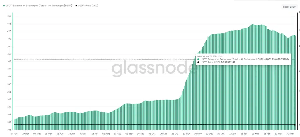 Nel grafico allegato “USDT: Balance on Exchanges (Total)”, si nota chiaramente che da inizio marzo c’è stato un decremento della liquidità presente sugli exchange, che può essere stata impiegata in acquisti.