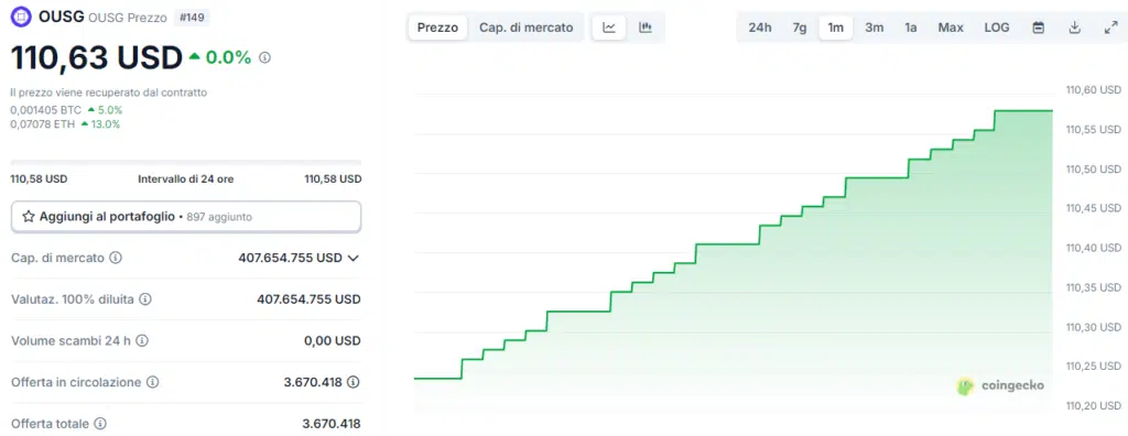$OUSG è un token che rappresenta un’esposizione tokenizzata a titoli di Stato USA a breve termine e consente di ottenere un rendimento stabile restando nell’ecosistema crypto.