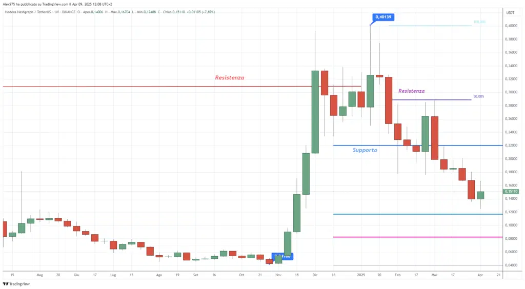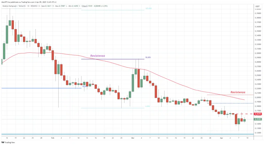 Analizzando il grafico daily, si coglie meglio la fase ribassista in atto da gennaio, caratterizzata da una sequenza di minimi decrescenti. Tre giorni fa, HBAR ha toccato un nuovo minimo a 0,12448 USDT, avvicinandosi al supporto, da dove è in atto un tentativo di rimbalzo.