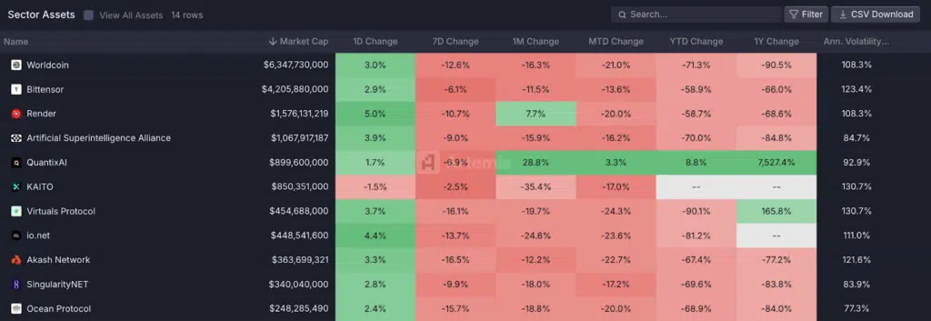 Più da vicino possiamo vedere le crypto AI che più hanno sofferto questo calo dell’attenzione speculativa. Progetti come Bittensor e Render perdono oltre il -60% rispetto allo scorso anno, seguiti da Akash e AIOZ Network che superano quota -70%. Il tanto discusso trio dell’Artificial Superintelligence Alliance, formato dall’unione di Fetch.AI, SingularityNET e Ocean Protocol, segna invece crollo abissale del -84%.