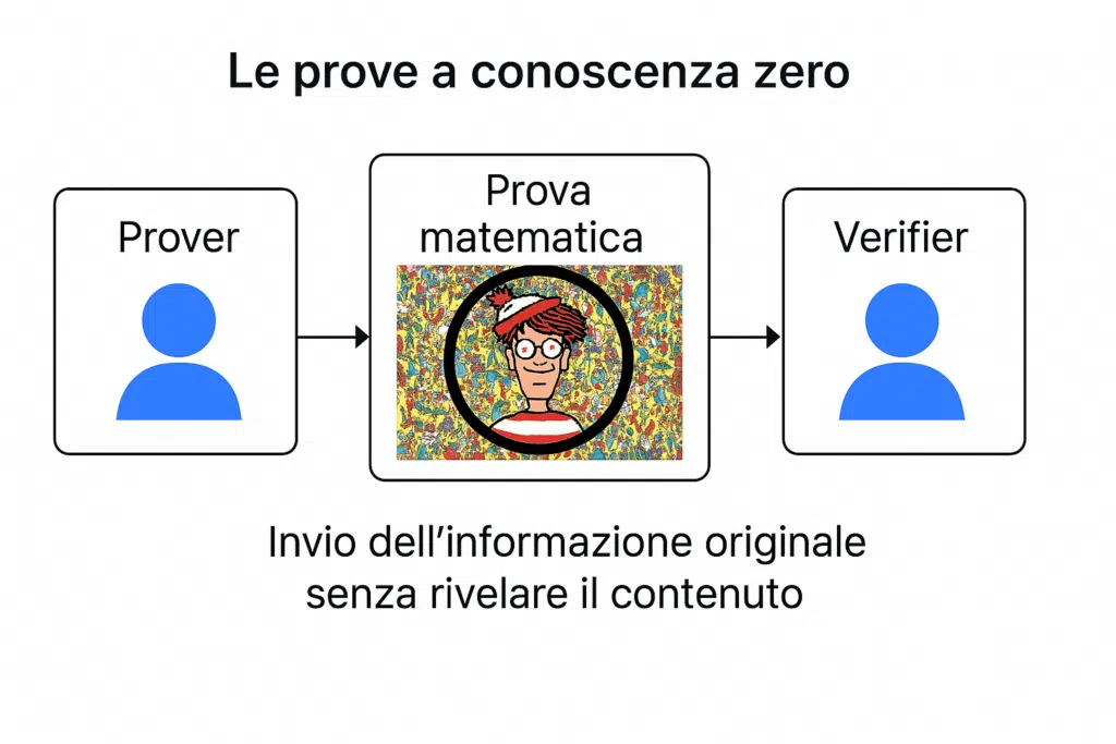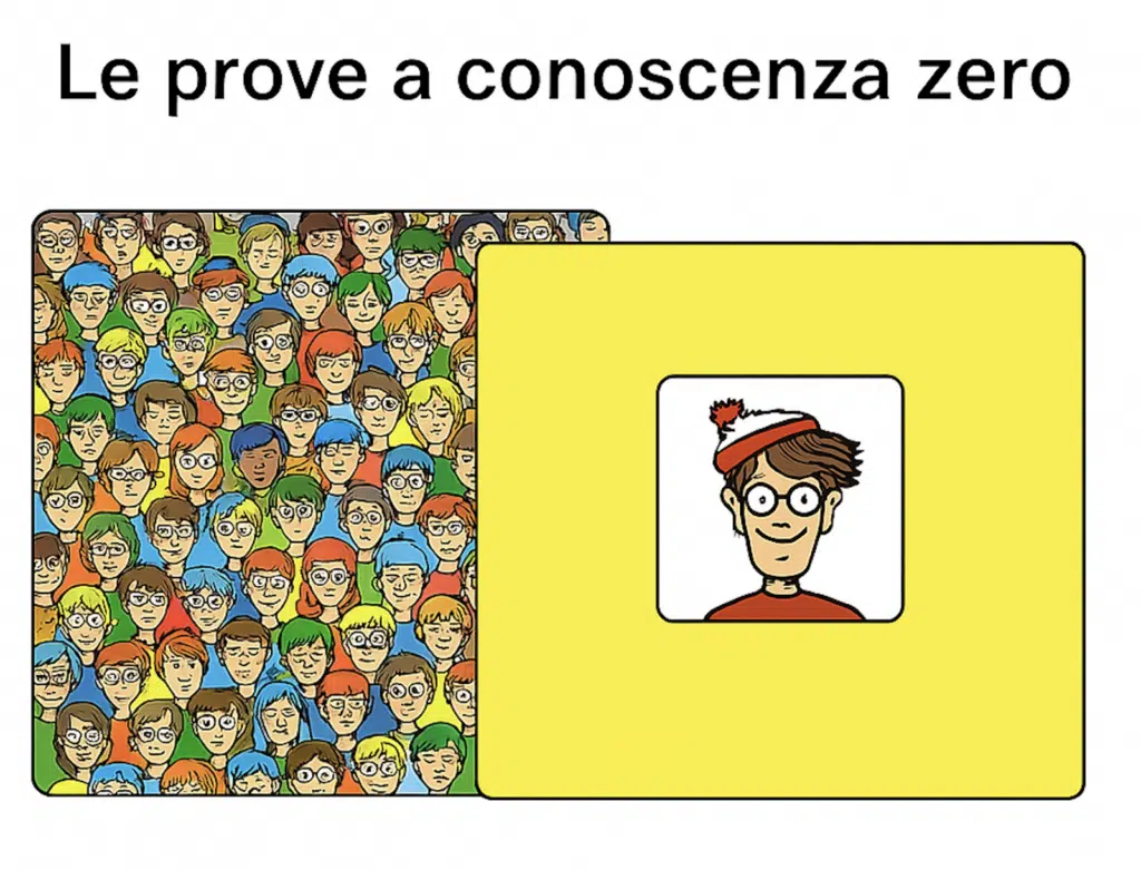 Le prove a conoscenza zero, o zero-knowledge proofs (ZKP), sono un’innovazione crittografica che permette a qualcuno di dimostrare di sapere qualcosa senza dover rivelare direttamente l’informazione in sé. Facciamo un esempio per rendere tutto più semplice: immagina di giocare a “Dove si trova Wally”, un noto gioco dove l’obiettivo è trovare Wally in un’immagine caotica con centinaia di volti diversi.