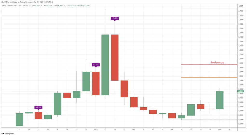 Sul grafico weekly possiamo osservare una panoramica dell’andamento di Fartcoin, evidenziando il boom iniziale del prezzo subito dopo la quotazione, culminato nell’All-Time High di gennaio. Questa fase di crescita è coincisa con il rally generalizzato del mercato crypto verso la fine del 2024.