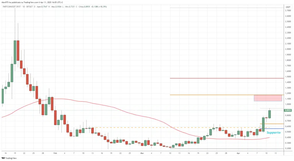 Passando all’analisi sul grafico daily, si nota che il prezzo, dopo un primo tentativo di rimbalzo, si era fermato sulla resistenza a 0,60 USDT. Dopo una fase di ritracciamento, due giorni fa $FARTCOIN ha nuovamente attaccato questa resistenza, rompendo il livello con decisione.