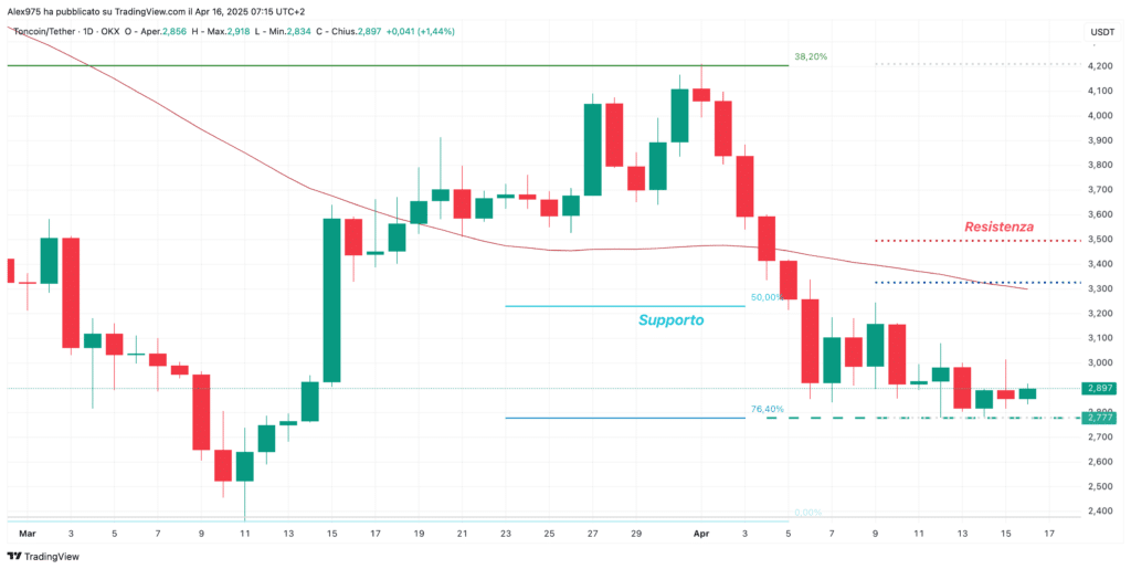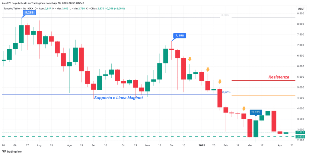 Dal grafico weekly allegato, si nota che dopo il minimo di marzo, TON aveva avviato un rimbalzo molto intenso, evidenziato da una candela settimanale da +29,78%. Tuttavia, con l’inizio di aprile e le nuove tensioni sui dazi, questo movimento si è interrotto, seguendo l’andamento ribassista dei mercati globali.