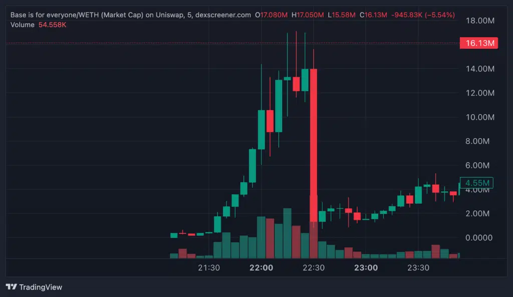 Il problema di questa vicenda è che dopo circa un’ora dal lancio lo stesso token è precipitato al ribasso, perdendo il -90% in soli 5 minuti di contrattazioni. Un rug eseguito in piena regola, che ha fatto scalpore vista lo “shilling” effettuato dall’account ufficiale di Base, dove il contenuto tokenizzato era stato presentato al pubblico. Ma chi è stato a tirare il tappeto?