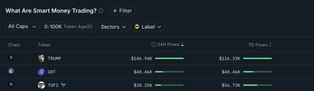 Tramite il sito specializzato naisen.ai, si può osservare che alcuni degli ‘smart money’ operanti sui DEX tracciati hanno iniziato ad accumulare il Trump Coin, che risulta essere quello che ha ricevuto più acquisti nelle ultime 24 ore.