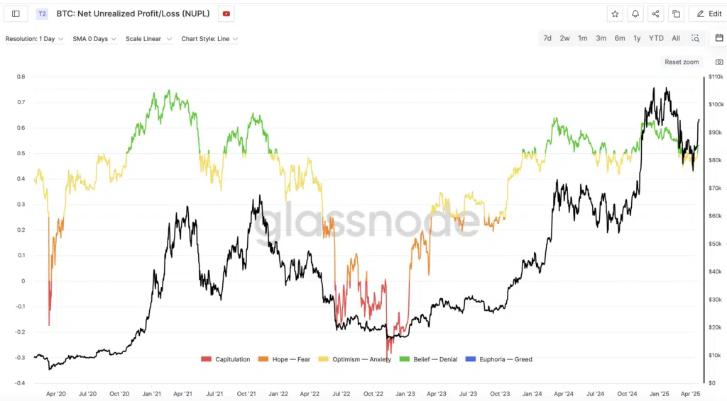 Il grafico utilizza colori distinti per rappresentare fasi psicologiche: Capitulation (rosso), Hope/Fear (arancio), Optimism/Anxiety (giallo), Belief/Denial (verde) e Euphoria/Greed (blu) Attualmente, il NUPL si trova nella zona optimism/anxiety, indicando che la maggior parte degli holder è in profitto, ma non ancora nella fase di euforia. Quindi abbiamo un altro elemento che, mostra ottimismo sul prezzo di Bitcoin, ma moderato senza eccessi.