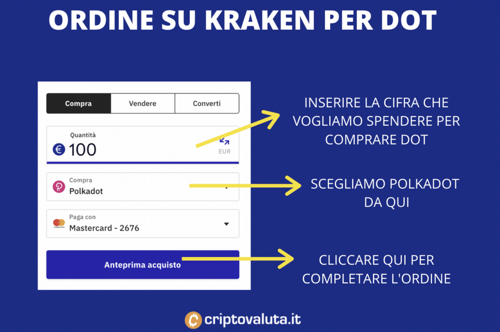 Non è difficile procedere con l’ordine. Dalla schermata principale di Kraken scegliamo ACQUISTA, per arrivare alla schermata che riportiamo qui sotto. Scegliamo prima l’importo in Euro da acquistare, poi invece scegliamo la criptovaluta – in questo caso Polkadot / DOT e poi selezioniamo il metodo di pagamento. Dovremo poi cliccare su ANTEPRIMA ACQUISTO, dove troveremo un riassunto del nostro ordine, comprese le spese di commissione.