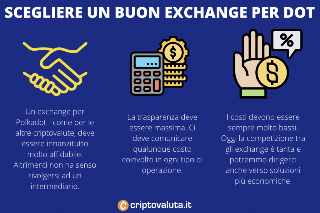 Gli exchange oggi sono intermediari decisamente regolamentati e che possono offrire un buon ambiente, sicuro e affidabile, a chi vuole fare acquisti su DOT o su altri tipi di criptovalute. Insieme, più avanti, riusciremo ad individuare i migliori disponibili sul mercato.