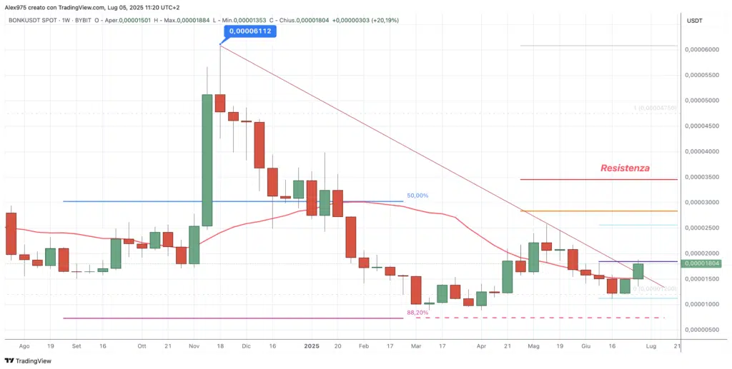 Sul grafico daily ci focalizziamo sulla fase di ribasso iniziata a maggio, quando BONK ha toccato 0,00002582 USDT, senza riuscire a superare la prima resistenza di lungo termine posta a 0,00002830 USDT.