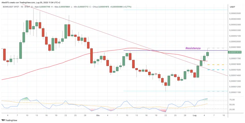 Fase di rimbalzo in corso sul grafico daily di BONK