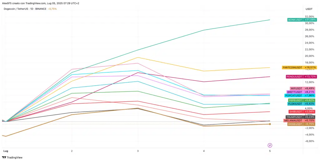 Segue Fartcoin con un +16,50%, mentre la peggiore è Dogeocin, in calo del -0,76%, che fa peggio anche del Melania Coin.