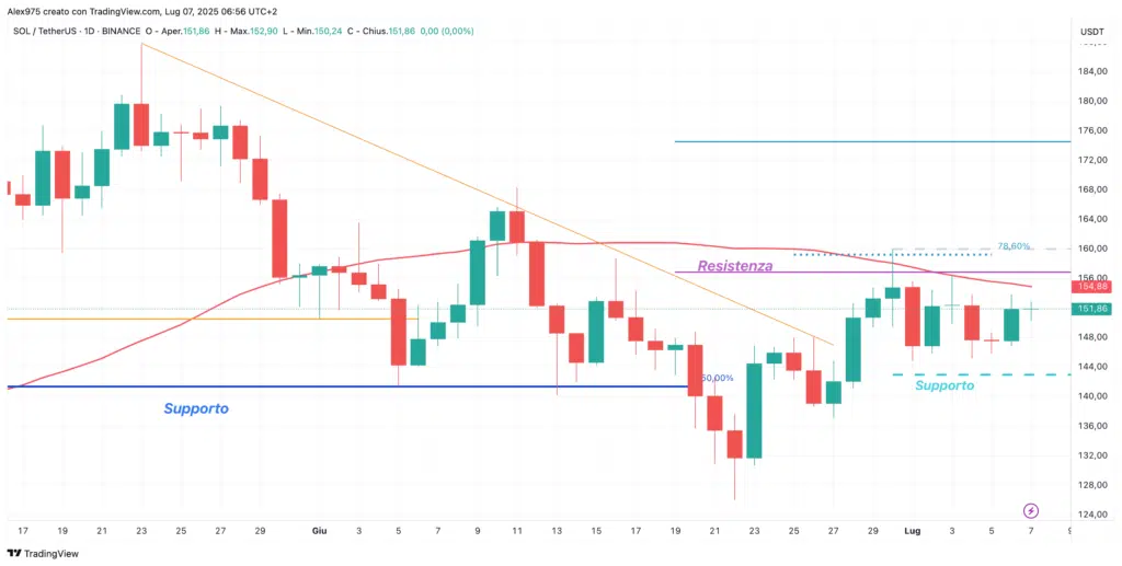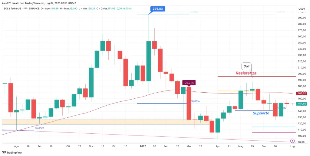 Considerando il vettore che va dall’ATH al minimo di aprile, la resistenza principale che il prezzo di SOL deve superare è in area 196–200 USDT. Un breakout deciso sopra questa fascia riporterebbe Solana fuori dalla zona ribassista, aprendo la strada a un possibile ritorno dell’uptrend.