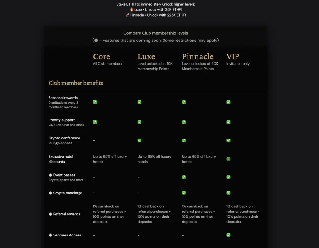 La carta è disponibile sia in formato virtuale che fisico, con 4 livelli di accesso (Core, Luxe, Pinnacle e VIP), ognuno con vantaggi crescenti in termini di cashback e servizi accessori. Troviamo benefit interessanti come l’accesso alle lounge delle conferenze, pass gratuiti per alcuni eventi crypto, cashback sui propri referrall ed altro ancora. Più si sale di livello, meno si paga di commissioni di transazioni e più si aumentano i tetti di spesa. Per il Luxe basta mettere in stake 25.000 ETHFI, per il Pinnacle ne servono 225.000.