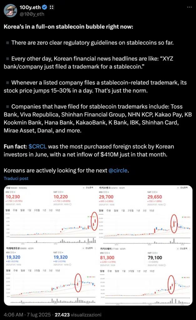 Il titolo statunitense è stato il più negoziato tra quelli esteri in Corea, tale da attirare l’attenzione di tutti i banchieri della zona, che ora provano ad approfittare del sentiment pazzo di questa narrativa. Sembra che l’effetto “Kimchi Premium”, osservato fino al 2021 sull’exchange Upbit in cui Bitcoin veniva negoziato ad un prezzo maggiore rispetto al suo prezzo reale, si stia in un certo senso riflettendo oggi sulle azioni CRCL. Non c’è nessun “premio” tecnico pagato dai traders come all’epoca, ma c’è un evidente massa di interesse da parte del pubblico retail, che non può passare inosservata.
