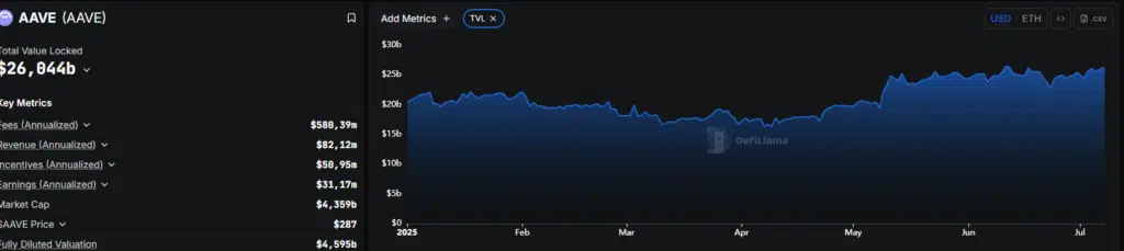 Ad oggi, AAVE è la prima blockchain per TVL (Total Value Locked), con un valore totale bloccato di 26,044 miliardi di dollari, in crescita del +6% negli ultimi 30 giorni. Nel grafico allegato si può osservare l’andamento da inizio 2025, con una crescita complessiva di circa 6 miliardi di dollari rispetto all’inizio di gennaio.