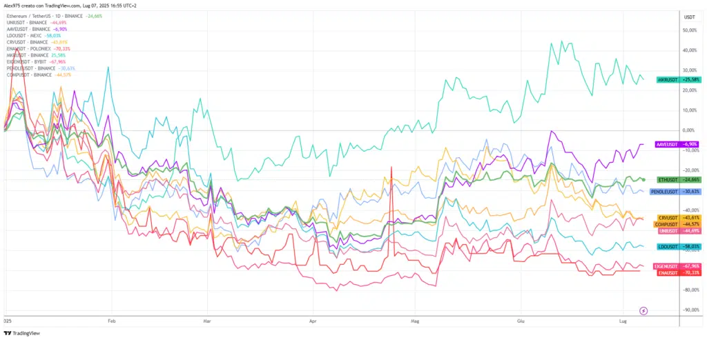 I numeri del rialzo in atto su AAVE – che si può acquistare con 20$ di BONUS GRATIS in CASH su Bybit – non riescono ancora a riportarlo in territorio positivo da inizio 2025, con una performance che resta a -6,20%. Tuttavia, a livello di token della DeFi, AAVE è tra i migliori da inizio anno, nonostante il segno negativo, come si può osservare dal grafico allegato con la panoramica dei principali token del settore.