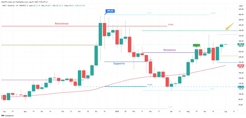 Passando ad analizzare il prezzo di AAVE partiamo dal fatto che il movimento rialzista del 2025 fa seguito a una solida performance nel 2024, anno chiuso con un +184%. Su questa view grafica weekly, abbiamo una panoramica dell’andamento di AAVE a partire dai minimi di luglio 2024 in area 70 USDT.