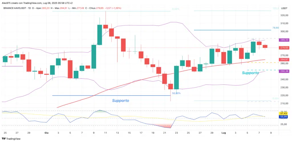 Il rimbalzo è attualmente del 35% e adesso AAVE ha come obiettivo un arrivo verso area 302 USDT. A livello di indicatori tecnici, l’RSI veloce non è ancora entrato in zona di ipercomprato, né il prezzo si trova esteso oltre la banda superiore di Bollinger. Questo suggerisce che c’è ancora spazio per ulteriori rialzi, almeno nel breve termine.