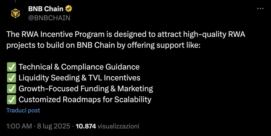 In pratica, per farla breve, BNB Chain sta mettendo a disposizione i primi capitali e il proprio know-how nella creazione di un progetto blockchain, per portare nuove idee e sviluppatori attorno alla cerchia RWA. È una sorta di investimento, che cerca in vie parallele di posizionare la rete tra i principali hub per lo sviluppo di soluzioni tokenizzate nei prossimi anni.