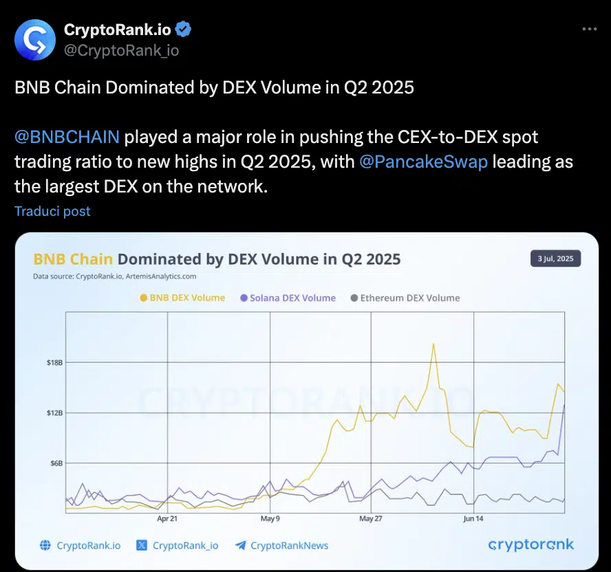Oltre agli RWA, la rete BNB Chain si sta distinguendo per un forte incremento dei volumi di trading registrati su DEX negli ultimi mesi. A partire da maggio c’è stato un grande boom degli scambi su questa catena, verosimilmente causato dall’entusiasmo per il programma airdrop Binance Alpha, che ha spinto traders e degens ad essere attivi il più possibile sulla scia di potenziali ricompense futures. Chiaramente PancakeSwap è l’exchange decentralizzato che ha guidato l’espansione, coprendo la quasi totalità dei volumi on-chain della rete.