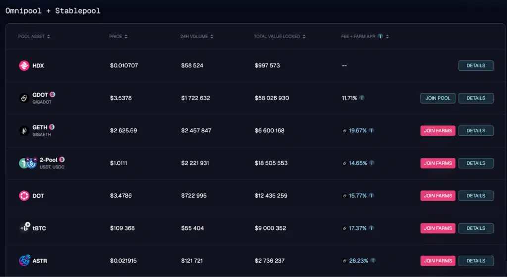Sull’Omnipool del DEX troviamo molte opportunità di yield interessanti, tra cui GETH ( versione sintetica di ETH) al 19,6%, USDT/USDC al 14,6%, DOT al 15,7%. tBTC ( wrapped BTC), al 17.37% e ASTR al 26,2%. In tutti i casi gran parte delle reward sono pagate in GDOT, che è appunto l’incentivo offerto dalla DeFi Summer di Polkadot.