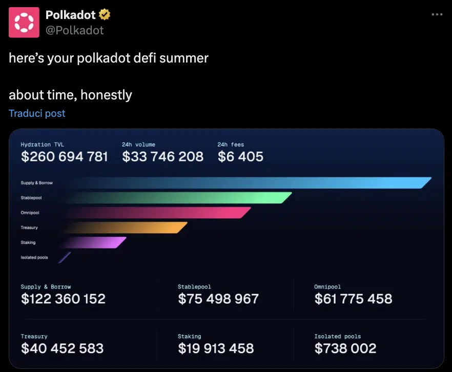 Con Hydration, Polkadot sta riscoprendo l’ebbrezza della DeFi, a lungo rimasta trascurata mentre altri ecosistemi guadagnano terreno. Ad oggi questo protocollo copre oltre il 90% del valore complessivo di tutte le parachain presenti, superando abbondantemente anche Astar e Moonbeam.