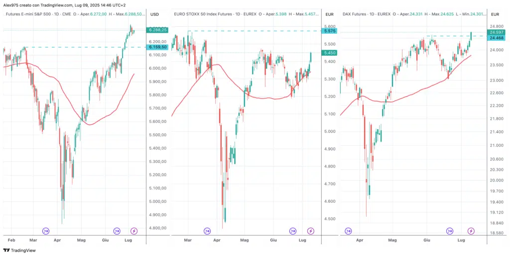 Nella giornata di oggi, al momento di questa stesura, anche il DAX ha segnato un nuovo massimo storico a 24.625 punti, rompendo il precedente di inizio giugno. In questo contesto, resta invece sotto il suo massimo storico lo STOXX, che attualmente segna 5.448 punti, mentre l’ATH di marzo è fissato a 5.575 punti.
