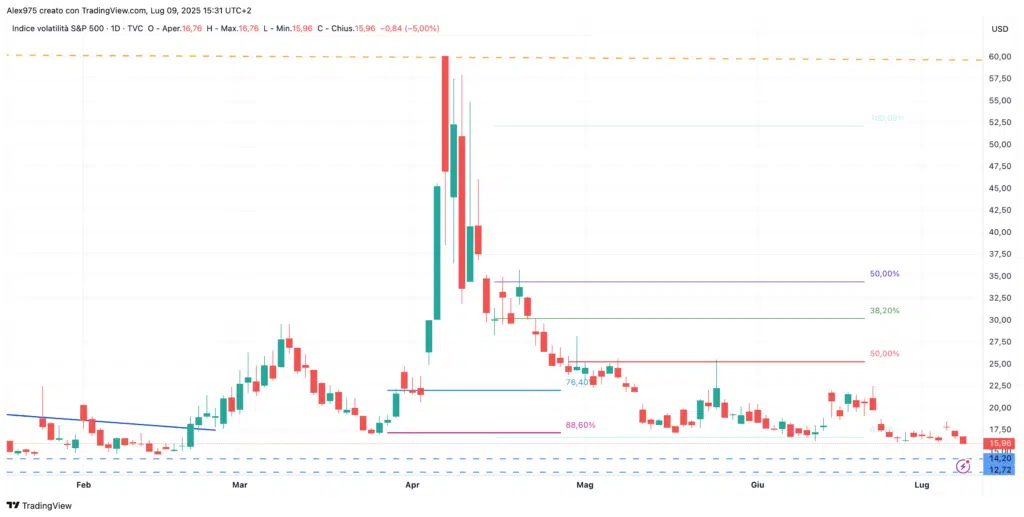 In questo scenario riportiamo anche il grafico del VIX, noto anche come indice della paura (misura la volatilità attesa sull’S&P 500 ed è spesso usato come termometro del sentiment degli investitori: valori alti indicano paura, valori bassi tranquillità). Il valore sta rientrando verso livelli che possiamo definire di calma. Lo ha fatto in modo graduale; tuttavia, trovandoci su nuovi massimi per l’S&P 500, presumibilmente dovrebbe essere già sceso verso un’area attorno ai 14 punti.