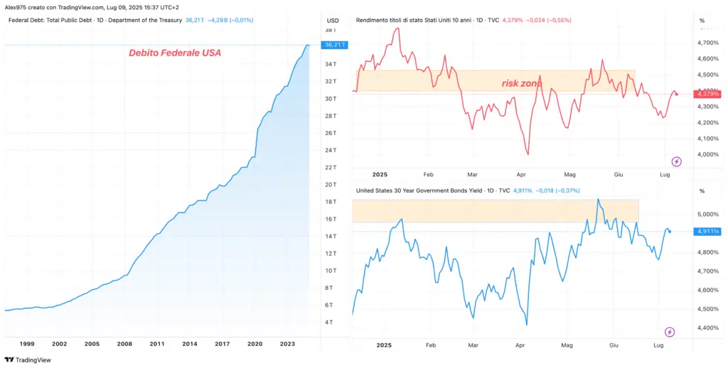 Un altro rischio — al momento silente ma potenzialmente esplosivo — riguarda il debito americano e il suo finanziamento. Sebbene il tema sia passato in secondo piano, il problema resta irrisolto.