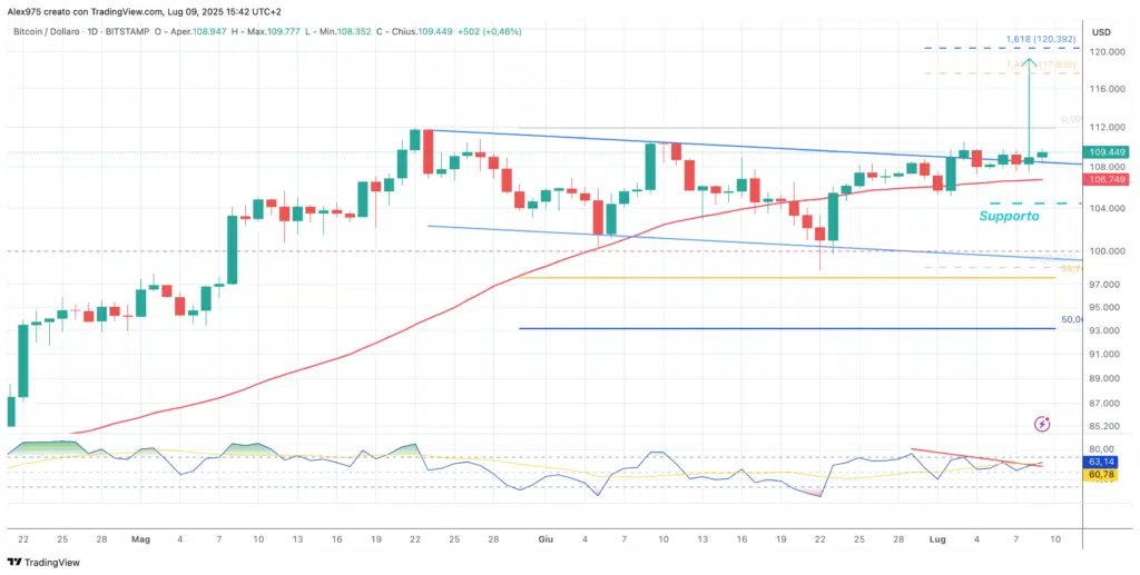 In questo scenario, il mercato crypto continua a mantenere il focus su Bitcoin. Come si può osservare dal grafico su scala daily, il prezzo si sta nuovamente avvicinando all’area dei 110.000 USD, con la concreta possibilità di una prosecuzione del movimento verso un nuovo ATH (All Time High) oltre quota 112.000 USD.