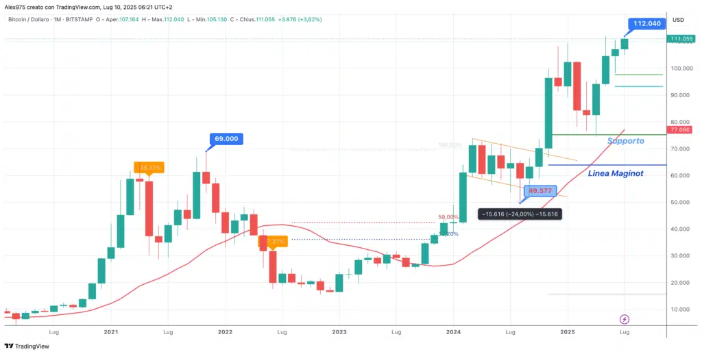 Sul grafico monthly allegato di Bitcoin possiamo osservare una panoramica storica che parte dal luglio del 2021. Qui si nota il primo massimo storico, registrato a novembre 2021 a 69.000 dollari, rimasto imbattuto fino a marzo del 2024.
