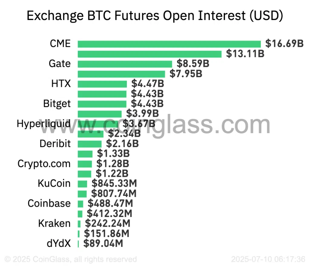 Di seguito alleghiamo anche i dati relativi al valore dell’open interest sui future di Bitcoin (BTC) per exchange. In testa c’è CME con 16,69 miliardi di dollari, seguito da Gate (13,11B) e HTX (8,59B). Hyperliquid, con 3,67 miliardi, si colloca al settimo posto, dimostrando un peso crescente nel settore DeFi. Il fatto che il CME sia il primo player mostra l’importante apporto del mondo degli istituzionali.