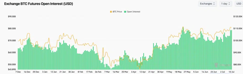 La fase di rialzo si BTC è sostenuta da liquidità e da alta attività sul mercato dei derivati, come mostra il grafico dell’Open Interest sui futures di Bitcoin, ovvero il valore totale dei contratti aperti (non ancora chiusi). Le barre verdi indicano l’OI, mentre la linea gialla rappresenta il prezzo di BTC.
