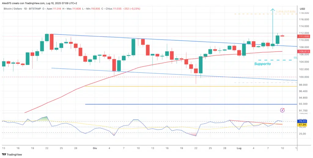 Con il breakout e il nuovo ATH, il prezzo di Bitcoin è entrato in una zona tecnica priva di resistenze chiare, spesso definita “terra di nessuno“, Con le estensioni di Fibonacci si può ipotizzare un allungo verso i 117.600 USD.