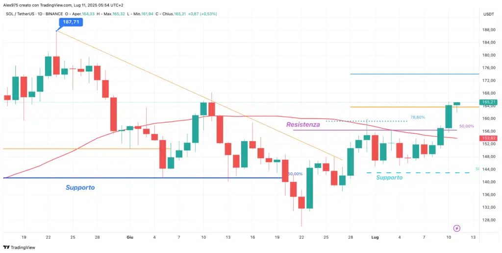Tornando ad analizzare il prezzo di Solana, ci focalizziamo sul grafico daily. La panoramica parte dal massimo di maggio a 187,71 USDT, seguito da una discesa fino al minimo di giugno a 126 USDT.