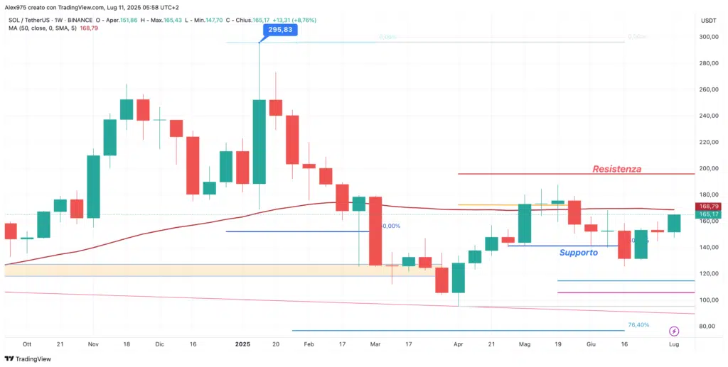 Allo stato attuale, SOL è sopra il minimo del 66%, ma resta comunque lontano dai massimi, e il movimento recente non mostra ancora segnali convincenti di inversione strutturale. Su questa view si può osservare che il prezzo di Solana è ancora sotto la SMA50 weekly e il livello di resistenza vettoriale principale passa a 195 USDT. Questo livello corrisponde al 50% di Fibonacci del movimento che va dall’ATH al minimo di Aprile.