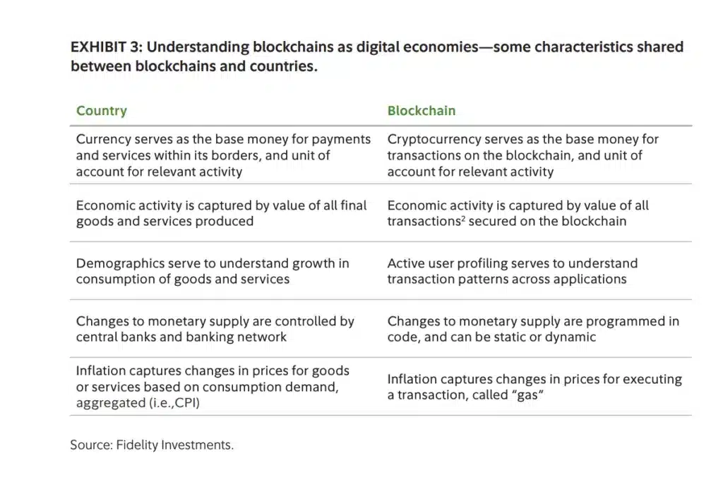 Tra le varie cose interessanti emerse dallo studio di Fidelity, troviamo anche una distinzione netta tra valute native di una blockchain, come ETH per Ethereum, ed i token che invece vengono generati al di sopra di queste infrastrutture. Questa visione contribuisce a dare un valore molto più prestigioso ad ether, che viene identificato come una specie di “moneta sovrana digitale”, strettamente legata alla salute economica della rete su cui opera.