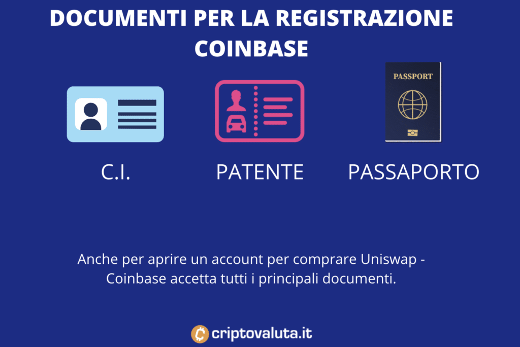 Come abbiamo detto sopra, tutti i migliori exchange impongono la verifica della nostra identità, perché devono necessariamente sottostare ai regolamenti KYC, ovvero Know your Customer, imposti in tutto il mondo economicamente sviluppato. Per questo Coinbase ci chiederà di inviare una foto di un qualunque documento emesso dalla Repubblica Italiana.
