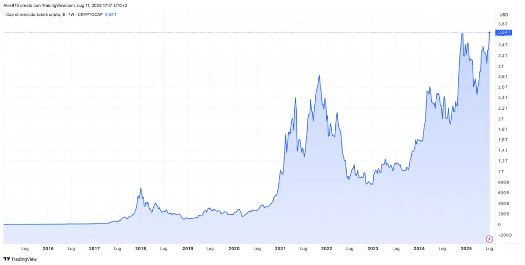 In questo contesto rialzista, va segnalato anche il nuovo record della capitalizzazione di mercato dell’intero settore crypto (Total Market Cap) che ha raggiunto i 3,64 trilioni di dollari, superando il precedente massimo registrato a dicembre 2024.