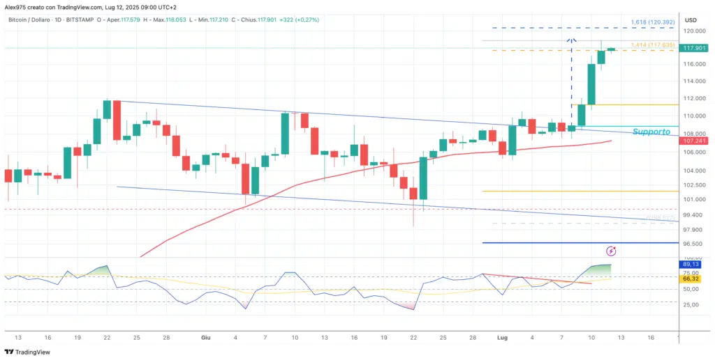 La seconda settimana di luglio è un’altra di quelle destinate a restare nella storia di Bitcoin (BTC), avendo registrato una serie di nuovi ATH. L’ultimo, in ordine cronologico, è quello raggiunto ieri a 118.839 dollari.