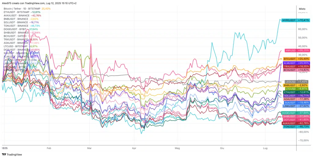 Da inizio 2025 Ripple registra un rialzo del +35%, risultando la criptovaluta con la migliore performance tra le Top 10, superando anche Bitcoin, che al valore attuale di 117.500 USD segna un +25,38%. Al terzo posto si colloca Stellar, con una crescita del 20%, storicamente legata a Ripple in quanto condivide lo stesso fondatore originario. In allegato abbiamo l’anadamento delle Top 10 da inizio anno.